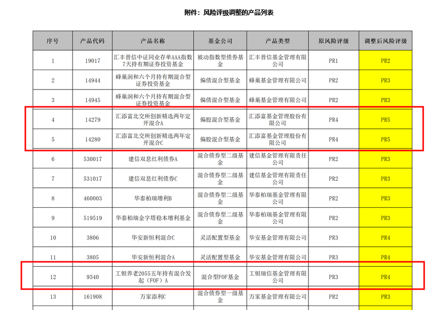 其中豪极资本,汇添富基金的两款北交所主题的偏股混合型基金从PR4上调至PR5(最高风险等级)。并且,颇为罕见的是,中信银行本次还将工银瑞信基金的一款养老主题产品“工银养老2055五年持有混合发起(FOF)A”的风险评级从PR3上调至PR4。