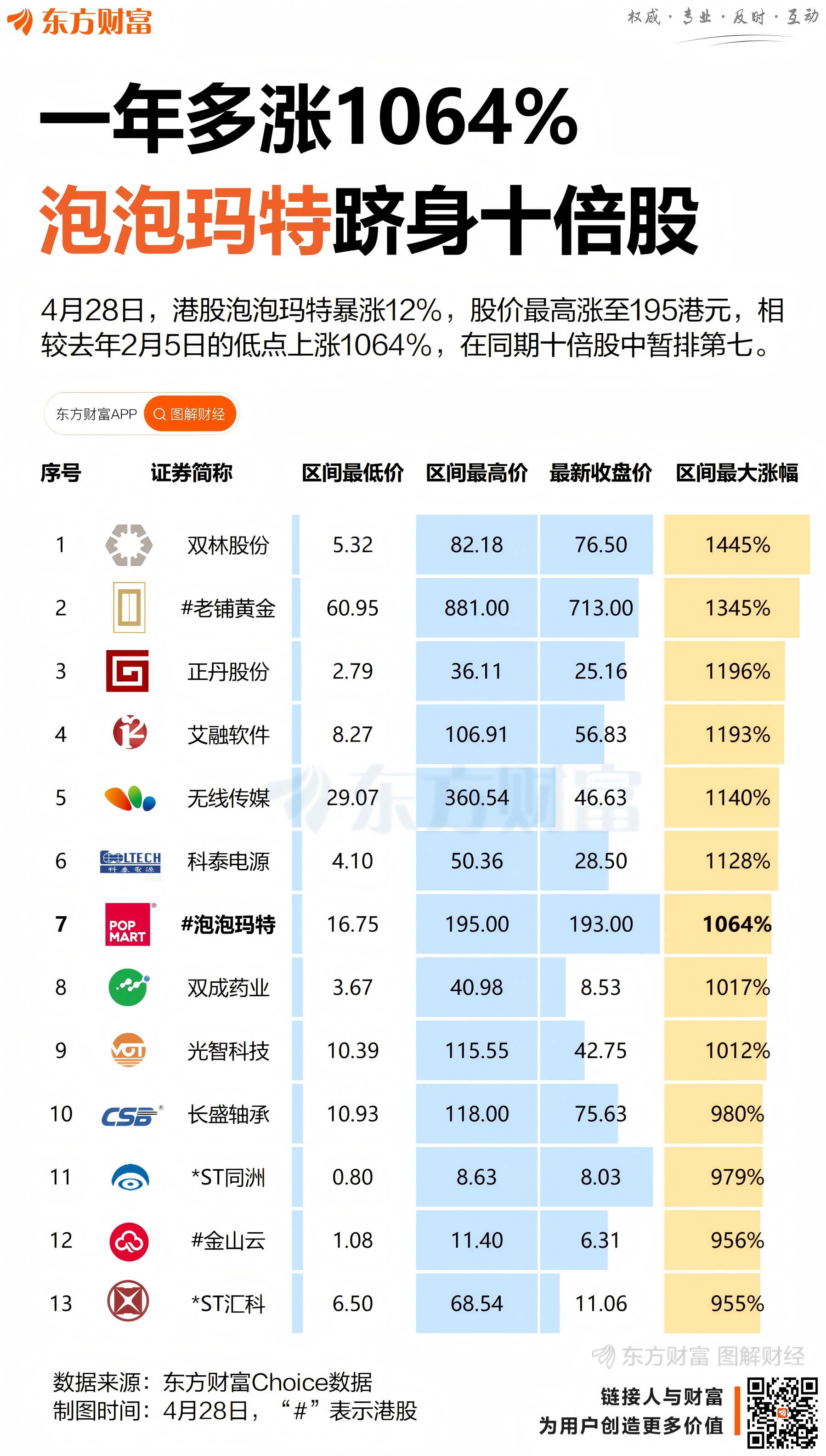 不过,泡泡玛特虽然表现极为强势,但在这批十倍股中并不算“最强”,1064%的区间最大涨幅,暂时只能排在第七。据东方财富Choice数据,去年2月6日,双林股份创下5.32元/股的新低,此后该股持续拉升,至今年4月24日创下82.18元/股的历史最高价,相较前低上涨1445%。