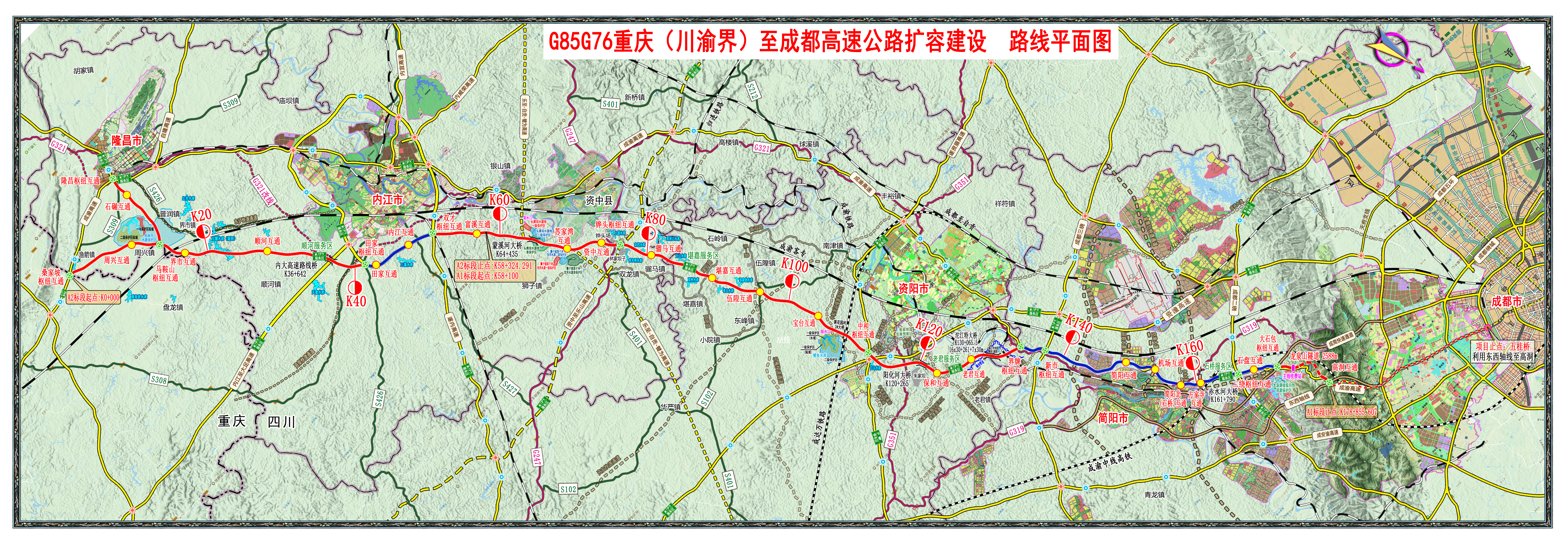 该项目起于内江市桑家坡(川渝界),接G85银昆高速公路重庆段,途经内江市、资阳市、成都市,止于龙泉驿区高洞,接已建成的成都市东西轴线城市道路,全长约190公里,其中主线长179公里,隆昌支线长11公里。